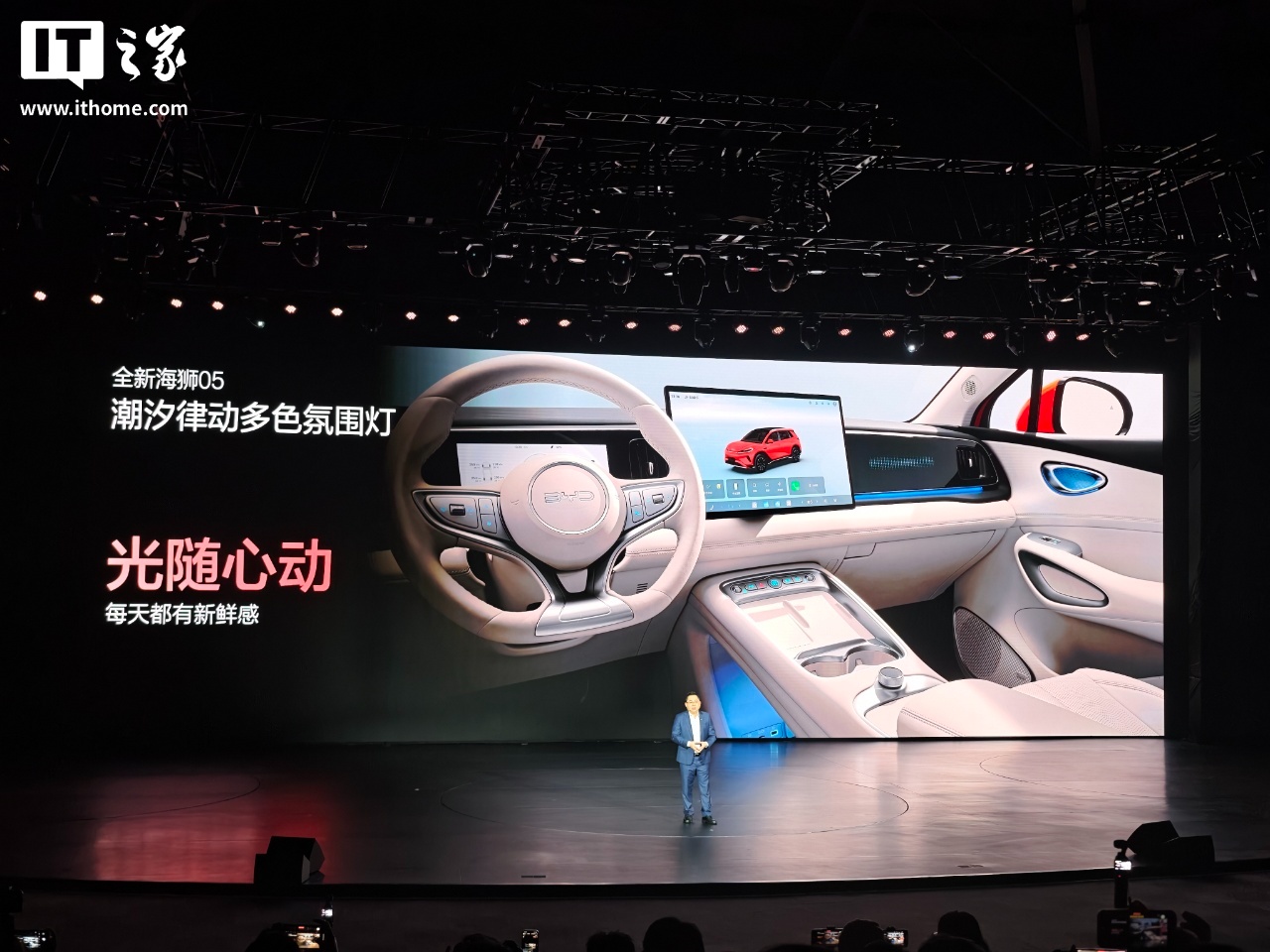 比亚迪全新海狮 05 还采用全新尾部设计,并提供杏仁米和暮色蓝两款内饰色;车内还有潮汐律动多色氛围灯,支持光随心动效果。