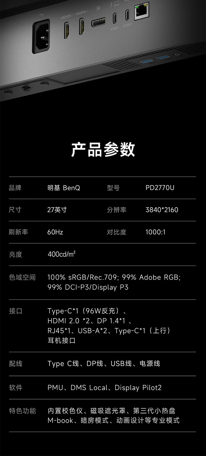 明基 PD2770U 显示器内置校色仪,磁吸支持定期自动校色;覆盖特殊抗反射涂层,明基还可安装磁吸一体式遮光罩;采用第三代无线“小热盘”控制器,英寸可调节色彩模式、示器售内色仪信号、置校遮光罩元KVM 等功能。磁吸