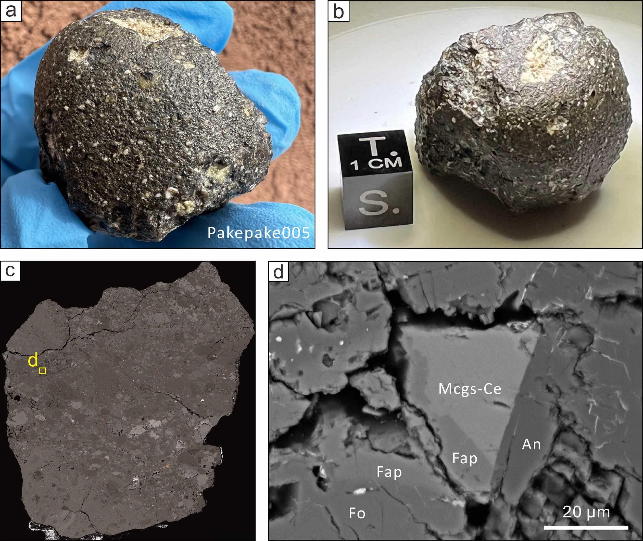 科研人员是嫦娥在第一块坠落在我国境内的月球陨石——Pakepake005陨石中发现铈镁嫦娥石的。