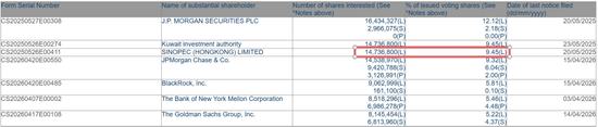 港交所权益披露数据显示,中石化(香港)持有宁德时代1473.68万股H股,持股比例约为9.45%。