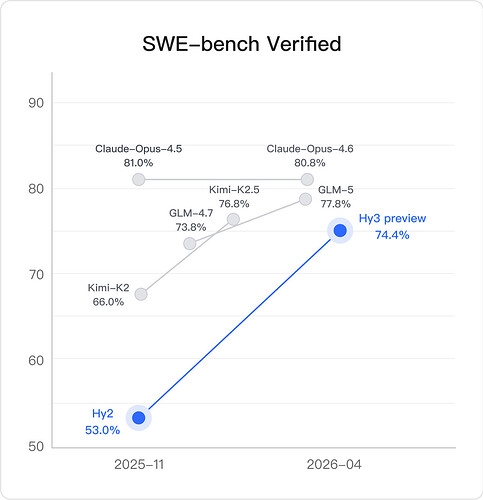 可以看出,Hy2在这个测试中只有53.0%的分数,Hy3 preview提升到了74.4%,编程能力猛增了40%以上,水平接近GLM-4.7了,不过距离GLM-5还有一点点距离,距离当前的标杆水准Opus 4.6还有较大距离。